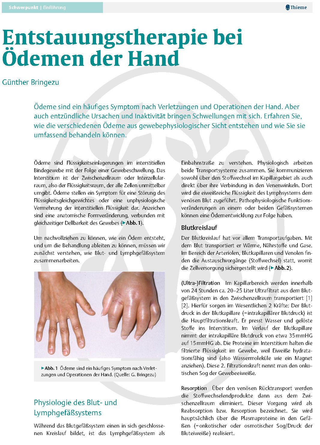 Der Artikel „Entstauungstherapie bei Ödemen der Hand“ von Günther Bringezu erläutert die Wirkprinzipien und den therapeutischen Ablauf der Manuellen Lymphdrainage (MLD) als zentrale Maßnahme zur Behandlung von Schwellungen der Hand nach Operationen, Verletzungen oder Entzündungen.