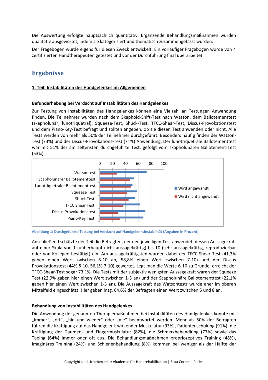 Die Auswertung „Ergebnisse der Umfrage zur Befundung und Behandlung von Instabilitäten des Handgelenkes“ von Cornelia Paries präsentiert eine bundesweite Erhebung unter 100 Handtherapeutinnen und -therapeuten zur klinischen Diagnostik und Therapie von Handgelenksinstabilitäten.