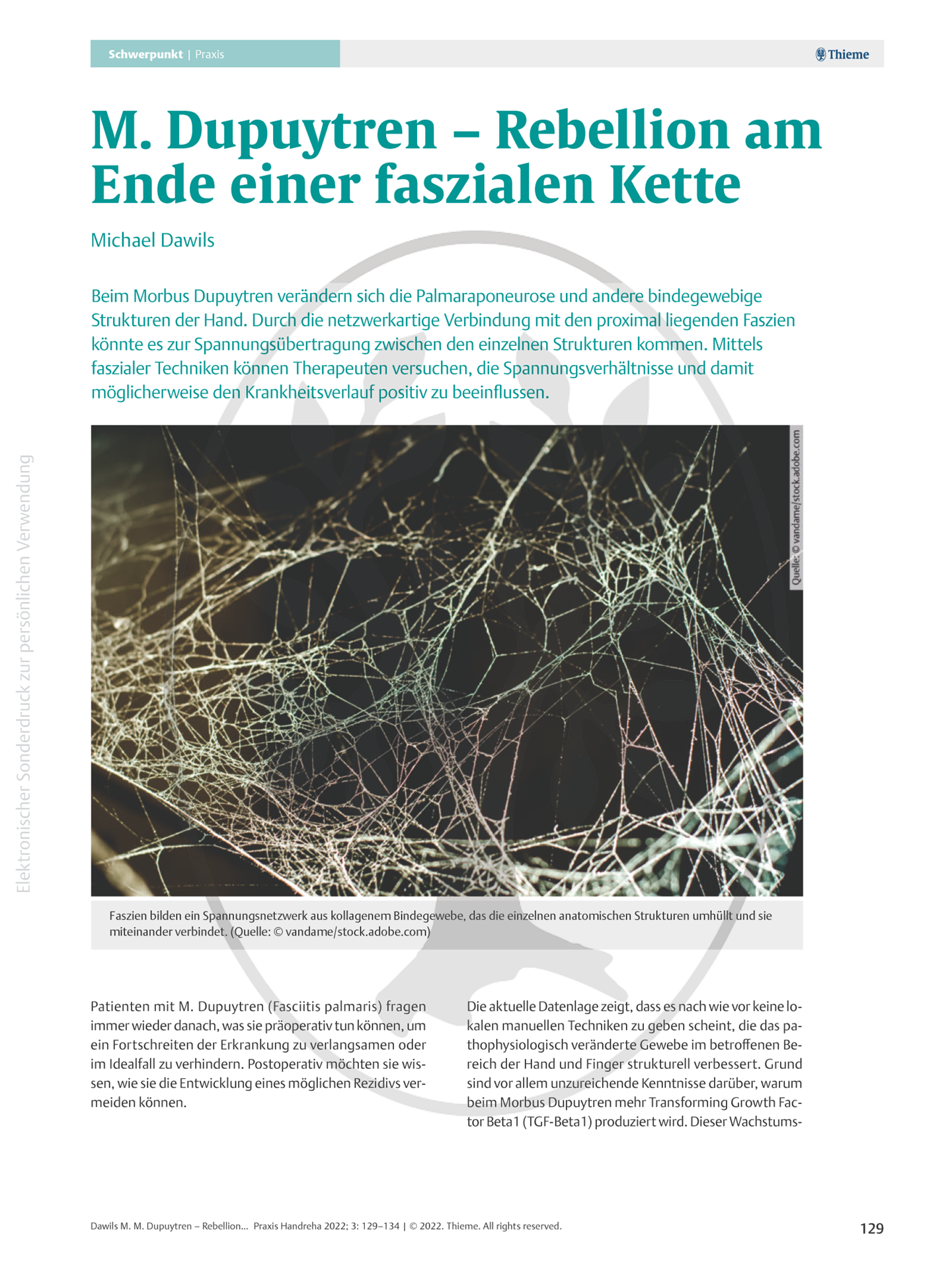 Im Fazit weist Dawils darauf hin, dass eine rein lokale Behandlung der Hand die komplexen faszialen Zusammenhänge nicht berücksichtigt. Eine ganzheitliche Betrachtung und fasziale Regulation könne jedoch helfen, Durchblutung, Stoffwechsel und Spannungsverhältnisse in der betroffenen Hand zu verbessern und damit den Krankheitsverlauf positiv zu beeinflussen.