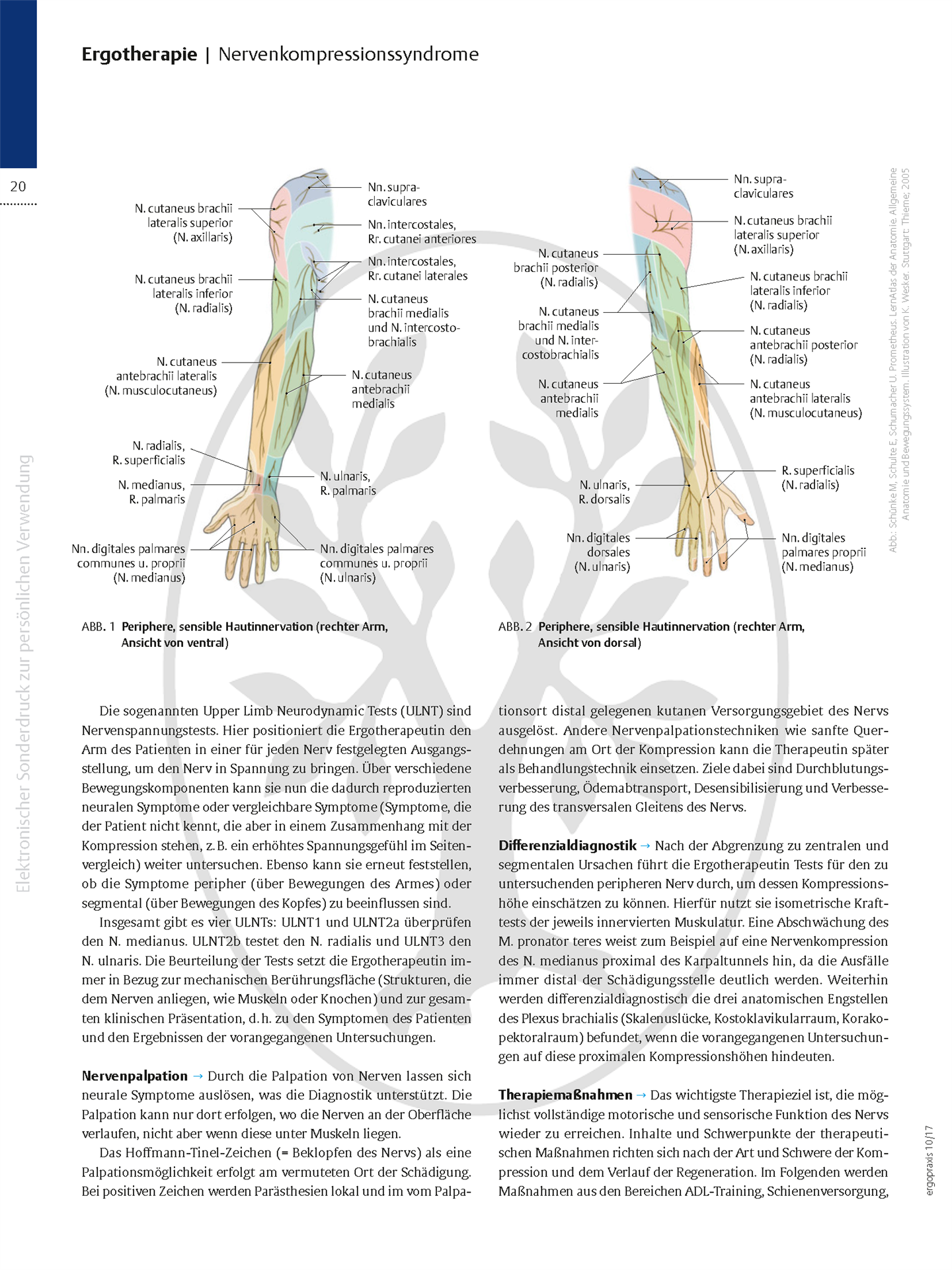 Anatomische Abbildungen zeigen die Nervenverläufe und sensiblen Innervationsgebiete und verdeutlichen, wie Überlastung, Druck oder Fehlhaltungen zu motorischen, sensiblen und vegetativen Ausfällen führen.