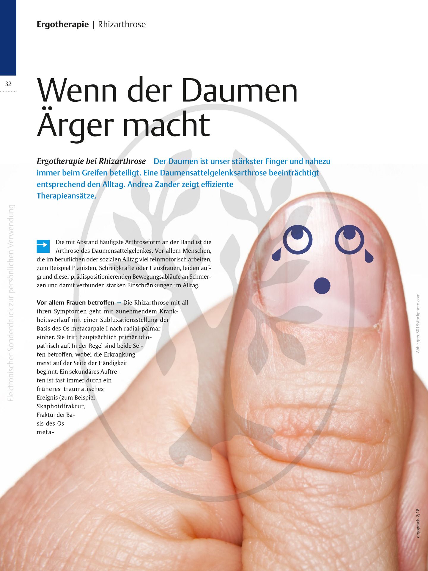 Betroffen sind vor allem Frauen über 50 Jahren, häufig nach den Wechseljahren. Ursachen sind monotone Handbewegungen, Überlastung und hormonelle Veränderungen, die zu einer Subluxation des Os metacarpale I und damit zu Schmerzen, Funktionsverlust und Instabilität führen.
